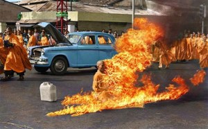 Il monaco buddista Thich Quang Duc si dà fuoco per protestare contro la politica di oppressione religiosa del dittatore cattolico Ngo Dinh Diem. Malcom Browne, che lo fotografa, vince il World Press Photo of the Year nel 1963 e il Premio Pulitzer nel 1964. Quando i monaci recuperano i resti di Thich Quang Duc e li cremano di nuovo, tra le ceneri ritrovano il suo cuore, intatto: per i buddisti è la prova inequivocabile della sua compassione, e da quel momento il monaco viene venerato come bodhisattva. Mentre gli statunitensi appiccano incendi con il napalm durante la guerra del Vietnam, il cuore di Thich Quang Duc viene conservato nel caveau della banca nazionale vietnamita.