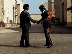 La cover del disco dei Pink Floyd “Wish you were here”, dove furono usati due stunt-man del cinema: l’uomo in fiamme è Ronnie Rondell Jr. I due si stringono la mano con la sinistra, perché quel giorno il vento tirava nella direzione sbagliata e Ronnie dovette mettersi da quel lato, per non dare fuoco all’altro stunt-man. Lo scatto è stato poi ribaltato in post-produzione.