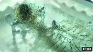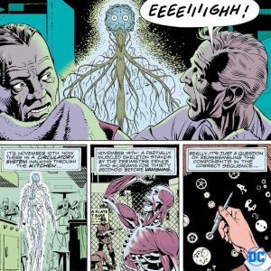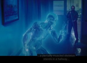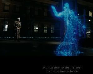 “Watchmen”, fumetto di Alan Moore del 1986 e film di Zack Snyder del 2009. Il personaggio di Jon Osterman, fisico nucleare, a causa di un incidente che ne causa la morte e la rinascita con poteri divini, acquista la capacità di leggere la realtà a livello sub-atomico: vede il mondo come una complessa interazione tra particelle elementari, e le attività umane gli sembrano poco interessanti e prive di senso; potendo vedere il proprio futuro, inoltre, sa che ogni avvenimento – e quindi le azioni di ogni essere vivente, lui compreso – è fissato immutabilmente nel destino, pertanto la consapevolezza che il libero arbitrio non esista non lo abbandona mai. Nelle immagini seguenti, dopo la sua morte, la sua ricomposizione nel mondo reale ripercorre l’anatomia umana, fino alla sua forma finale.