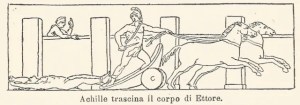 “…e una sconcia offesa pensò contro il morto nemico: / i tendini forò, giù dal mallèolo al calcagno, / dell’uno e dell’altro piede, vi strinse guinzagli di cuoio, / e al carro poi l’avvinse, lasciando che il capo pendesse. / Poi sopra il carrò salì, l’armi fulgide sopra vi pose, / vibrò la sferza; e pigri non furono alla corsa i cavalli. / Un polverone si levava dal corpo via tratto, le chiome / belle pendevano sparse, il viso che tanto fu vago, / tutto giaceva nella polvere. Giove così concedeva / nella sua terra materna, di lui tanto strazio ai nemici. / Tutto così si bruttava di polvere il capo; e la madre / si lacerava le chiome, lontana gettava il suo velo / morbido, e un ululo fiero levava, osservando suo figlio.” (Omero, Iliade.)